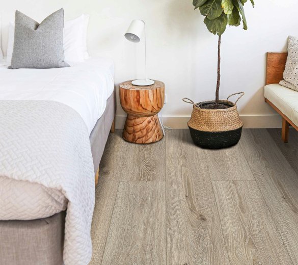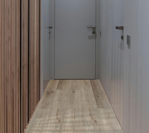 Dzięki nowoczesnej konstrukcji typu click, panele są łatwe i szybkie w montażu – bez konieczności stosowania kleju. Ich 5-milimetrowa grubość i warstwa użytkowa 0,55 mm zapewniają wysoką odporność na zużycie, wgniecenia i zabrudzenia, co czyni je idealnym wyborem zarówno do domów, jak i przestrzeni komercyjnych. Dzięki klasie użytkowej 23/33, panele świetnie sprawdzą się w często uczęszczanych pomieszczeniach. Są odporne na wilgoć, zarysowania, mają doskonałą stabilność wymiarową i mogą być stosowane z ogrzewaniem podłogowym. To rozwiązanie, które łączy trwałość z nowoczesnym wyglądem. Wyrazista struktura drewna została odwzorowana za pomocą technologii EIR (Embossed in Register), dzięki czemu faktura panelu jest zsynchronizowana z rysunkiem słojów, co potęguje wrażenie naturalności.