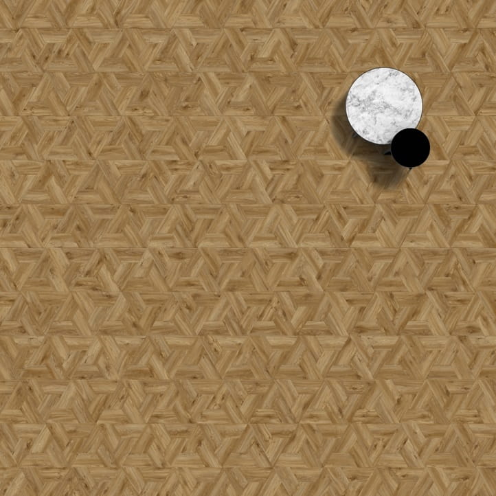 Trójkąt jest podstawą wielu motywów geometrycznych. W naszym wzorze trójkątów jest to podstawowy element składowy. Obejmując główną rolę, kieruje spojrzeniem i wypełnia pomieszczenie charakterem. Dzięki zastosowaniu różnych odcieni drewna efekt jest naturalny, ale graficzny.
